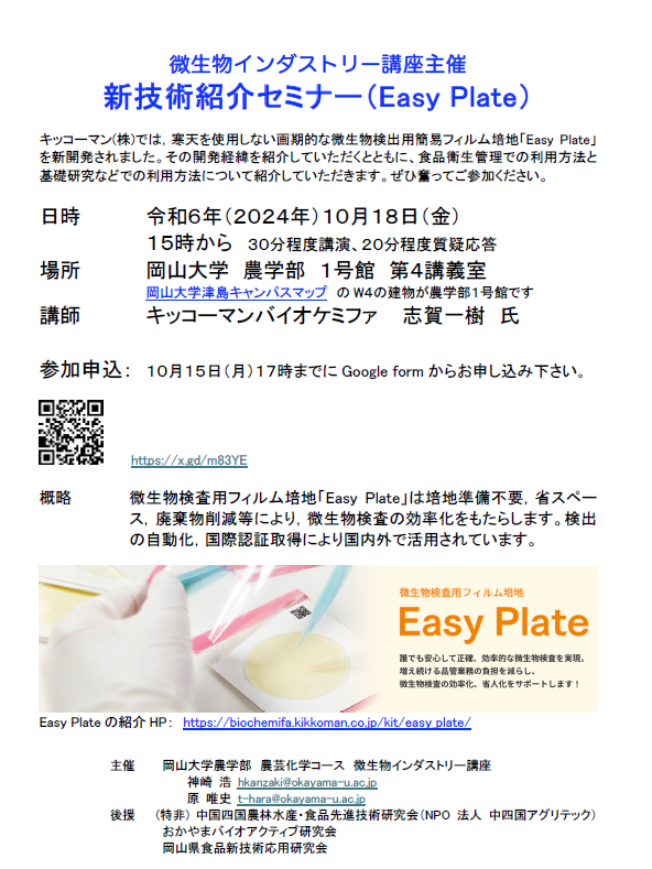 微生物インダストリー講座主催で、新技術紹介セミナー(Easy Plate)を開催します。